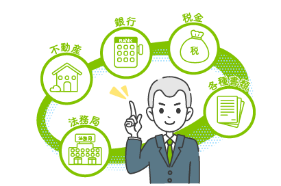 登記・申立などの各種手続き、公正証書などの書類作成、相続税などが発生する場合の税理士連携を窓口一本化で同時並行にて対応。